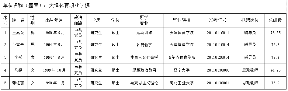 根据《天津市事业单位公开招聘人员实施办法(试行)》(津人社局发〔2011〕10号)文件精神,下列人员经笔试🌙、面试🕵🏽、体检、考察等程序确定为拟聘人员💁🏼‍♀️,现予公示。