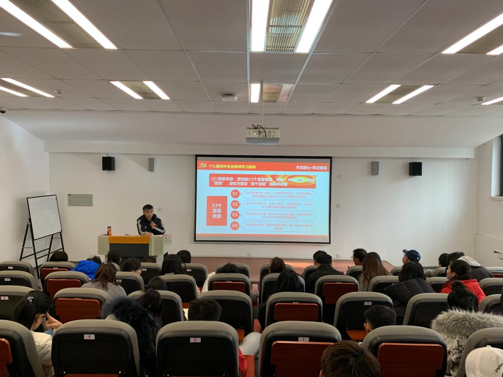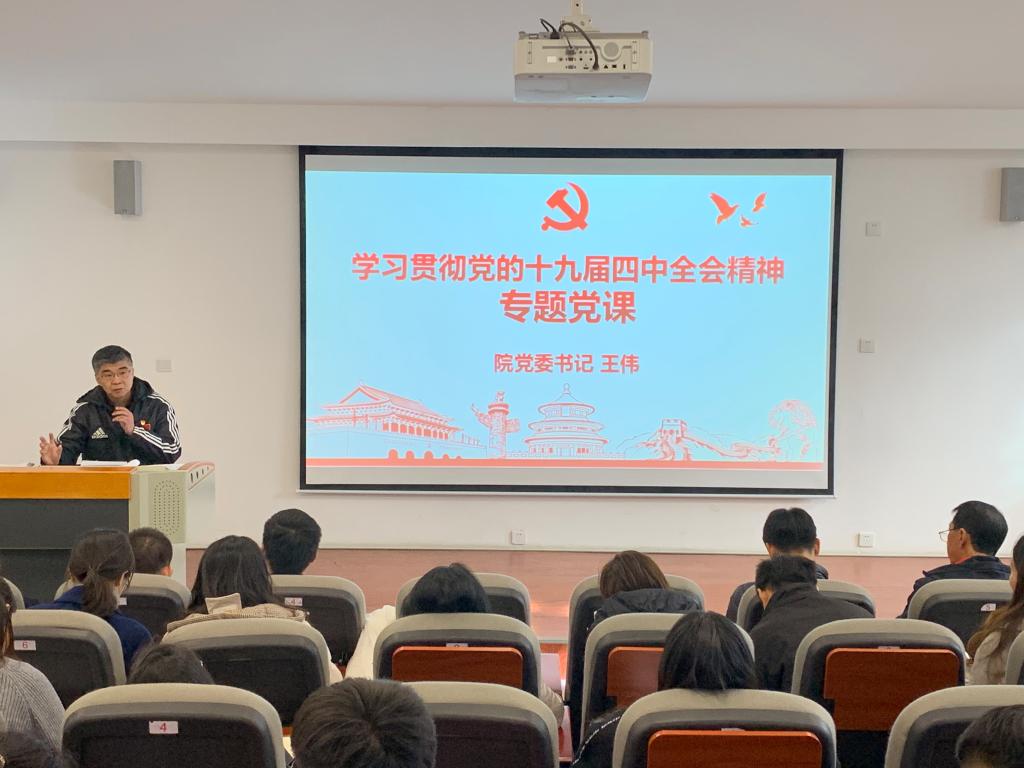 为深入学习宣传贯彻党的十九届四中全会精神,按照局党委、市委教育两委的部署要求,11月27日上午🏆,学院党委书记王伟在第一阶梯教室讲授党的十九届四中全会精神专题党课🫏。院纪委书记沈茹劼、全体教职员工、部分团员干部和学生入党积极分子参会👨🏼⚕️。