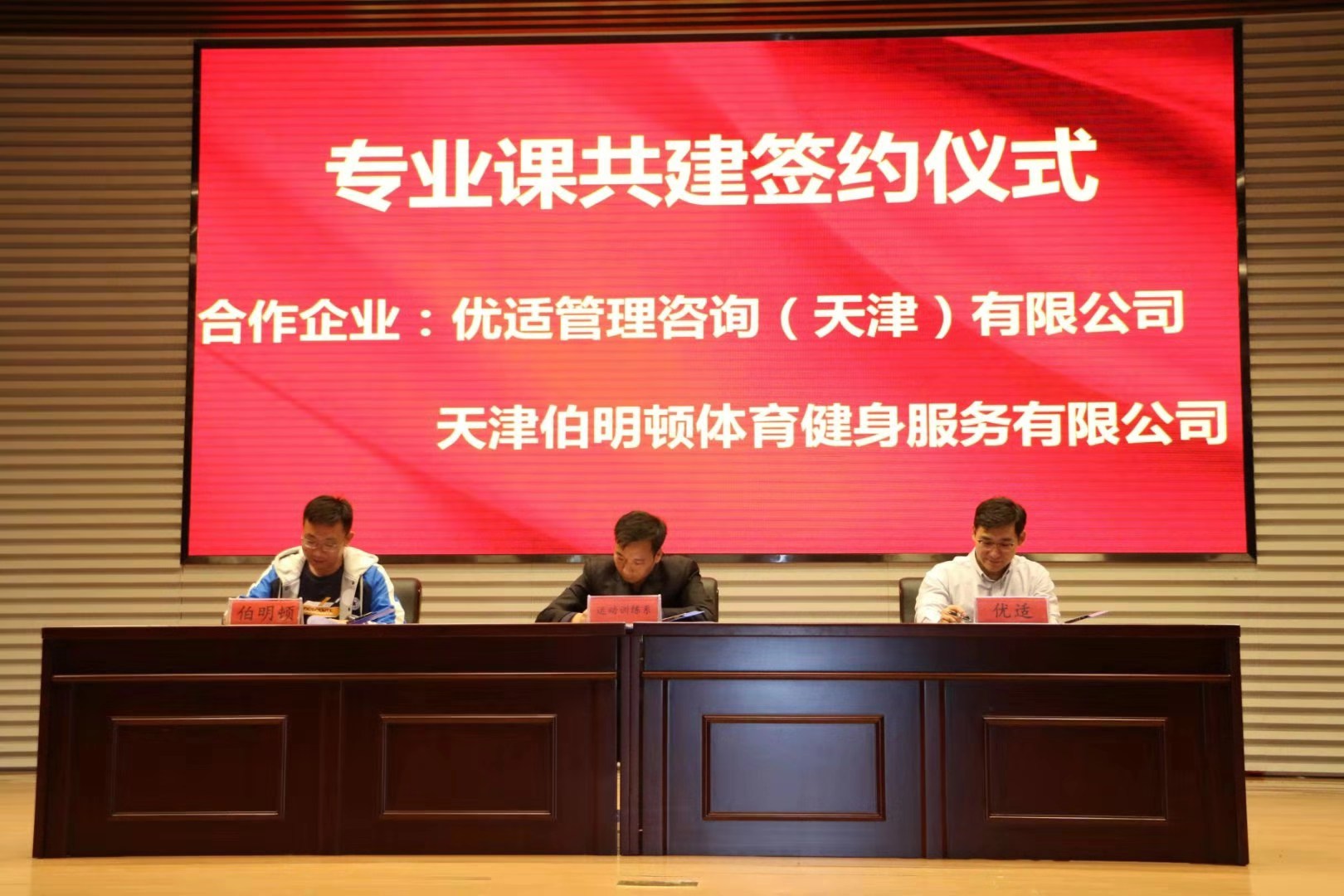 随后,院运动训练系主任潘政彬用多媒体方式从多个方面向参会企业嘉宾介绍运动训练专业发展情况,结合实例深入浅出讲解了学院专业特色🚵🏼、专业定位以及发展趋势。运动训练专业2017级同学王贵杰和毛艺杰作为优秀学生代表上台分享在企业的工作经历和感悟🧖♂️。分享结束后,潘政彬与优适管理咨询(天津)有限公司总经理邢恩源、天津伯明顿体育健身服务有限公司总经理李元签订了专业课共建合作协议。学院领导为各位企业家颁发聘书,为多位校内指导专家颁发证书🥬。