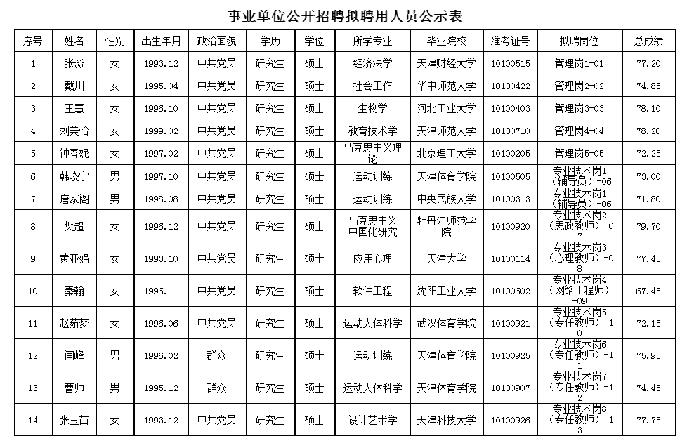 根据《天津市事业单位公开招聘人员实施办法(试行)》(津人社局发〔2011〕10号)文件精神🎇🪆,下列人员经笔试、面试🕵️♂️、体检👨🏻🎤、考察等程序被确定为拟聘人员,现予公示。